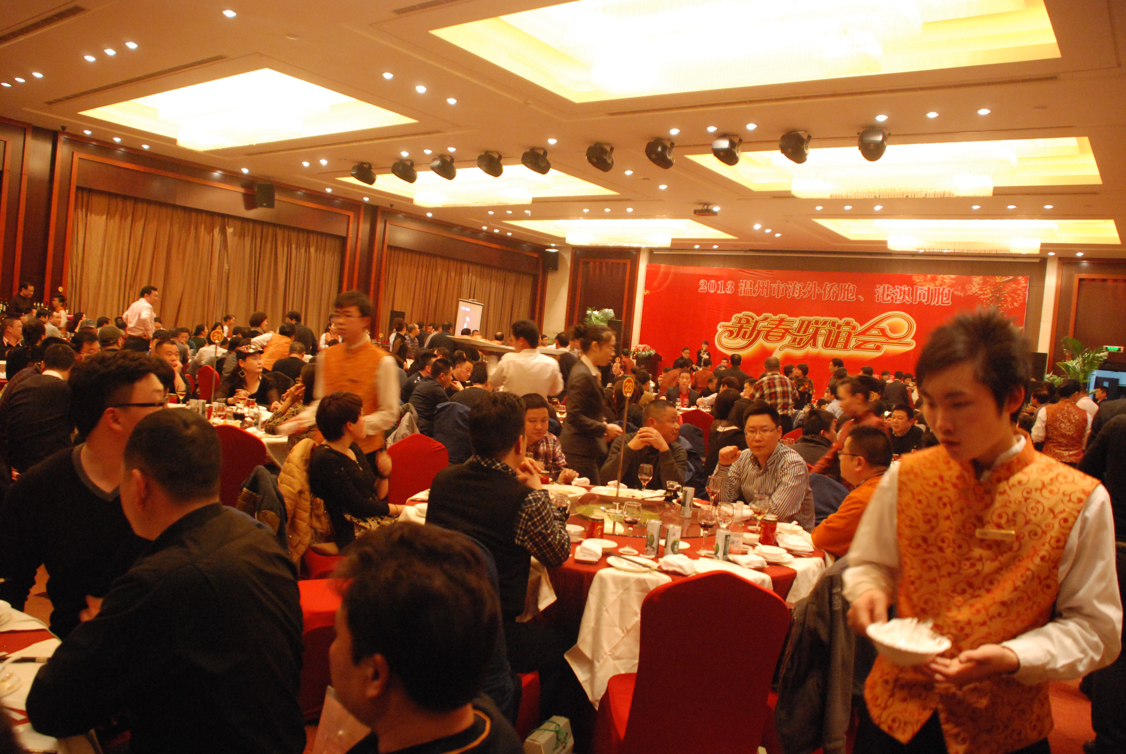 晚上, 盛大“2013年温州海外侨胞、港澳同胞新春联谊会”在滨海大酒店滨海厅举行, 作为温州海外侨胞之一即是滨海大酒店董事长冯定献先生, 一直以来从各个层面积极关注和参与家乡的投资建设,此次联谊会冯定献先生携同酒店全体员工热情接待各位海外侨胞、港澳同胞等贵宾的光临,积极宣扬温州的投资环境和优惠政策。