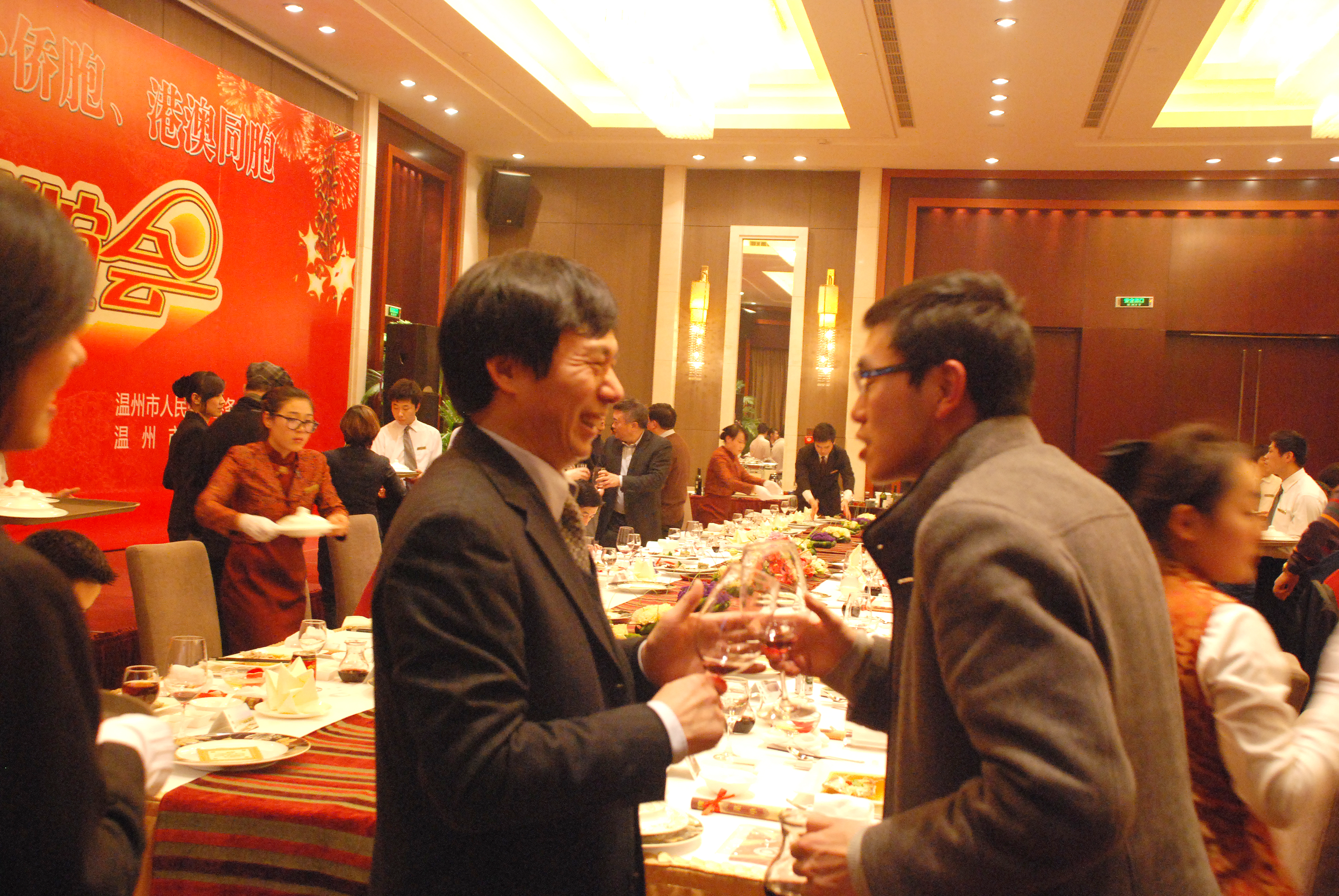晚上, 盛大“2013年温州海外侨胞、港澳同胞新春联谊会”在滨海大酒店滨海厅举行, 作为温州海外侨胞之一即是滨海大酒店董事长冯定献先生, 一直以来从各个层面积极关注和参与家乡的投资建设,此次联谊会冯定献先生携同酒店全体员工热情接待各位海外侨胞、港澳同胞等贵宾的光临,积极宣扬温州的投资环境和优惠政策。