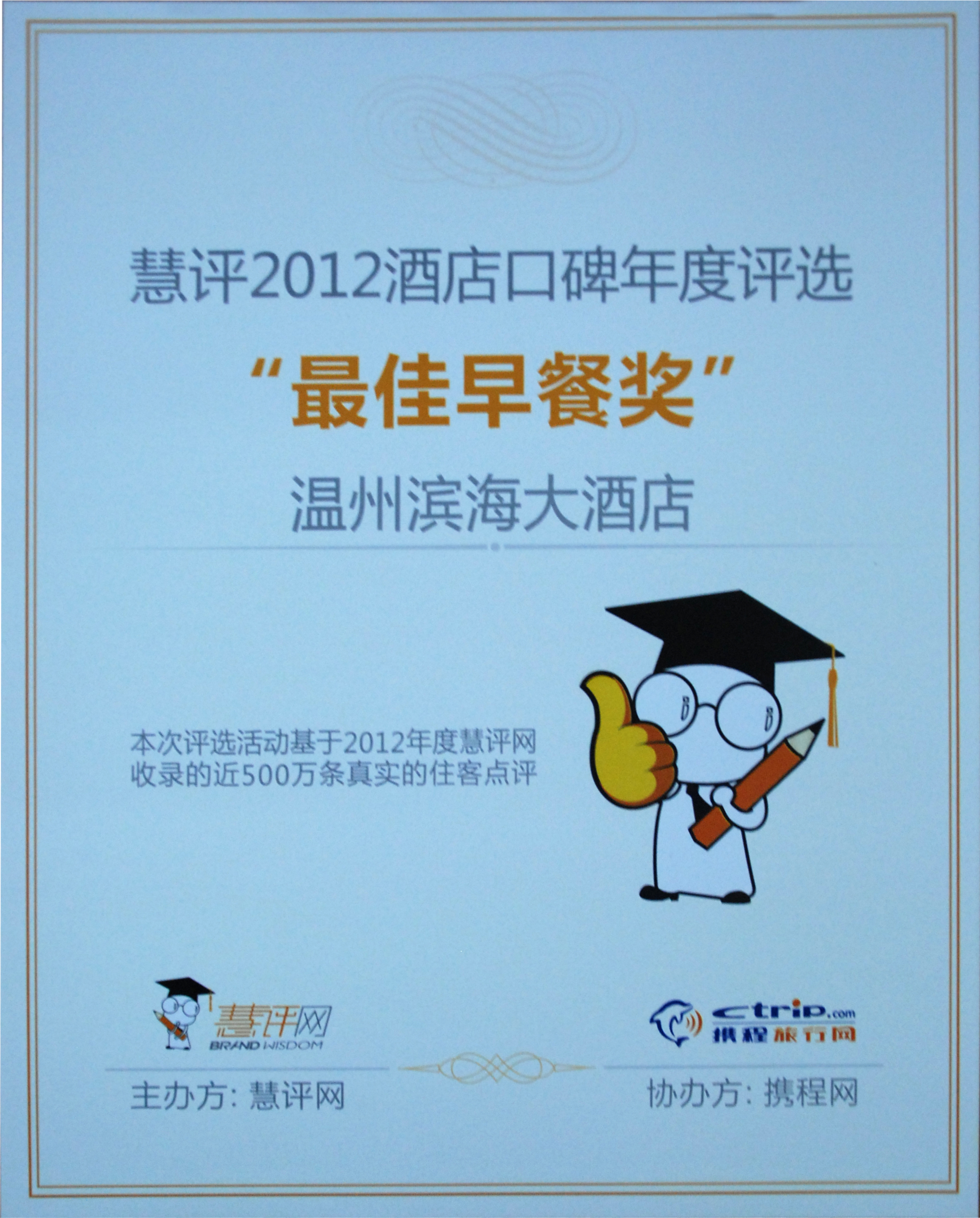 近日,由慧评网主办“2012酒店口碑年度评选”活动。温州滨海大酒店获得了“最佳早餐奖”的殊荣。本次评选活动基于2012年度慧评网收录的近500万条真实的住客点评进行评选。评奖面向全国所有酒店展开。据了解,慧评2012酒店口碑年度评奖活动依托慧评网在语义分析和数据挖掘中的专业技术,本着公正、公平的原则,汇聚互联网主要站点上的消费者点评观点,对酒店进行维度精细评比,从消费者角度选出不同维度下的最棒酒店。